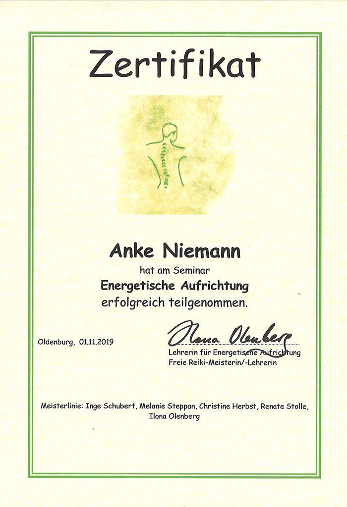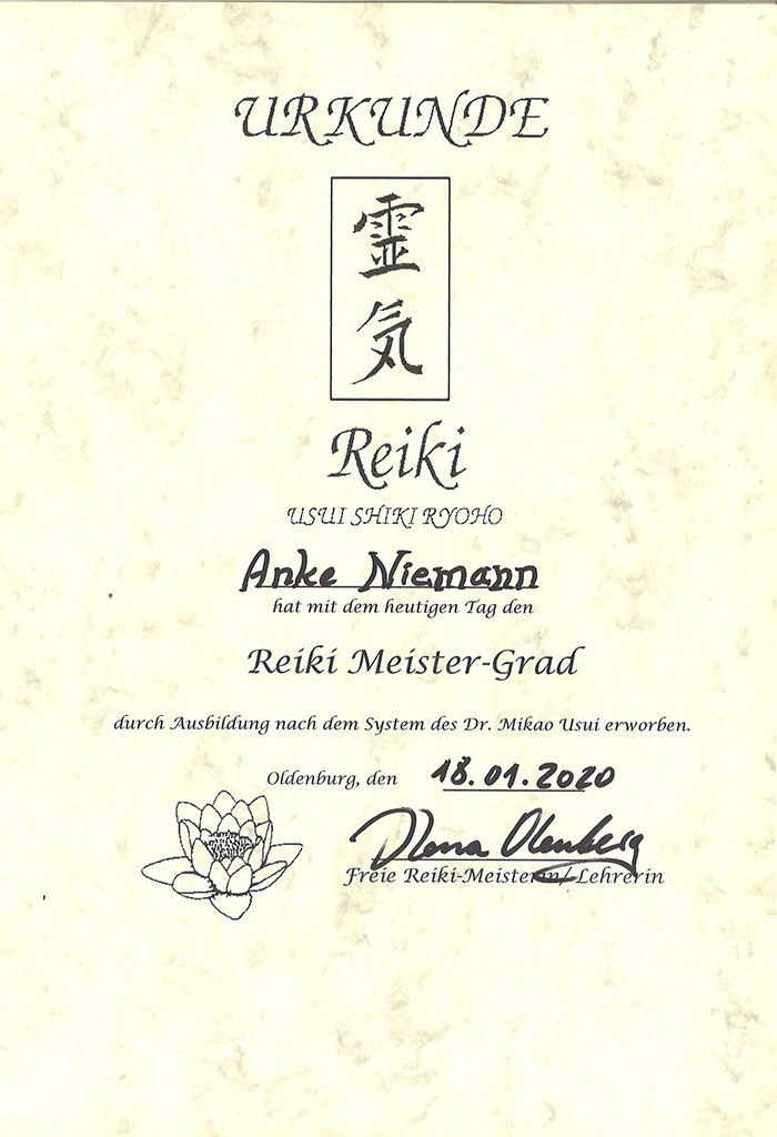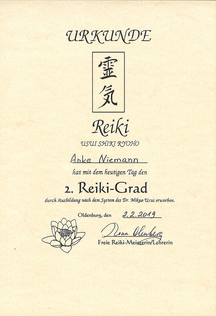 Diese Erfahrung beeindruckte mich so, dass ich den Meistergrad absolvierte, damit ich neben den Behandlungen auch die Kunst des Reiki auch an andere Menschen weitergeben kann.